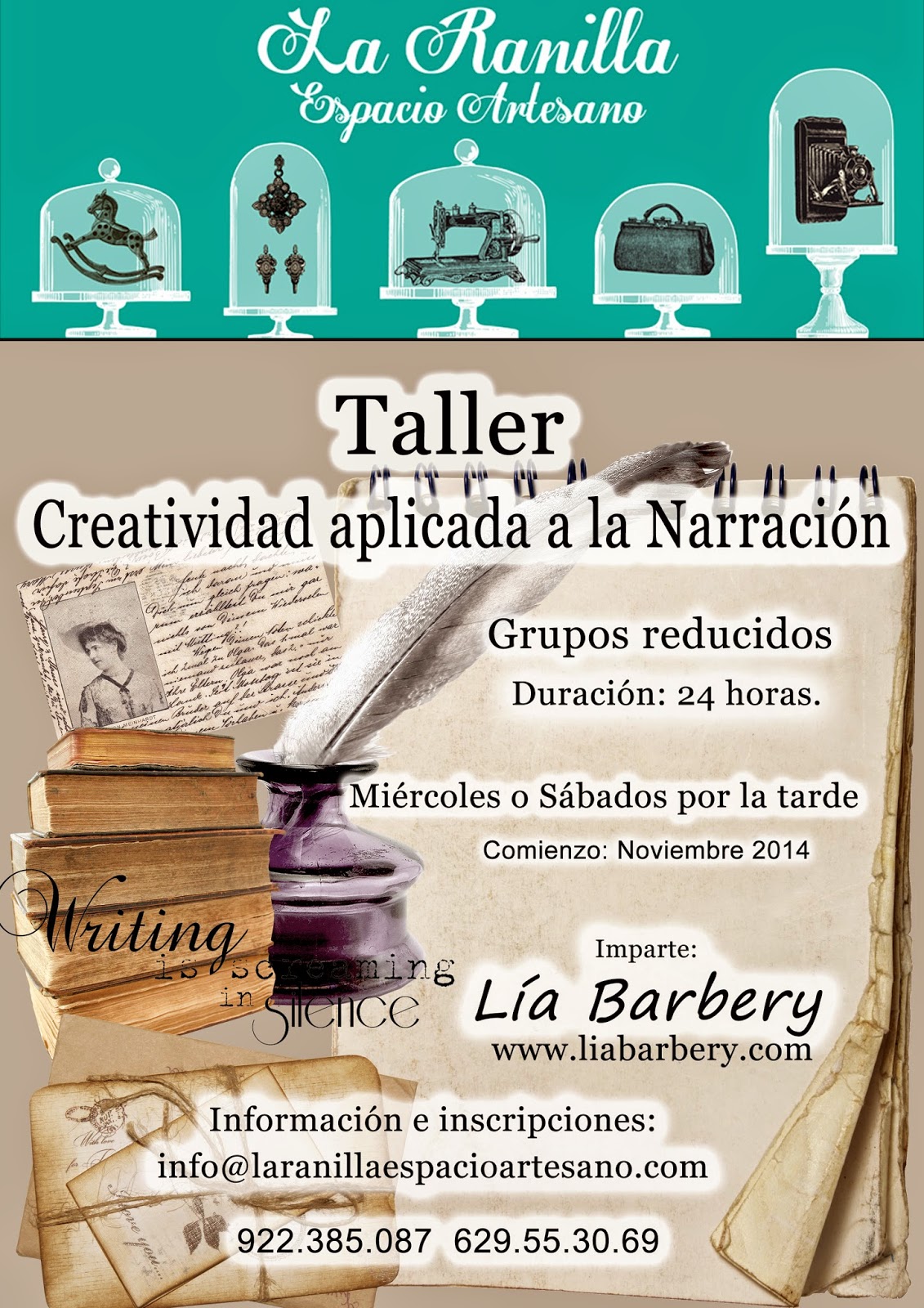 Taller: CREATIVIDAD APLICADA A LA NARRACIÓN. Imparte Lía Barbery por Lola Reyes | Oct 16, 2014 | Sin categoría | 0 Comentarios CREATIVIDAD APLICADA A LA NARRACIÓN 5 DE NOVIEMBRE 2014 Imparte: Lía Barbery (Escritora y Coach Personal) Inscripciones: info@laranillaespacioartesano.com Deja un comentarioCancelar respuesta
